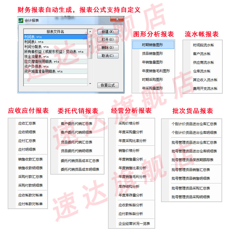 应收汇总表、应收明细表、客户销售订单汇总表、供应商采购订单汇总表、日记账汇总表等 |